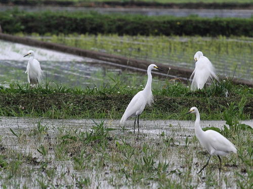 | チュウサギ[5月18日] ここに4羽、少し離れて1羽、計5羽いました。 | チュウサギ[5月18日] どれも夏羽ですが、手前のは目が赤くなり婚姻色が出ています。 | |