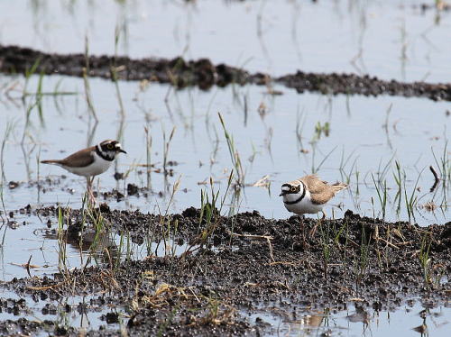 | チュウサギ[5月7日] 往きは居なかったのですが帰りに2羽見かけました。 | コチドリ[5月7日] 昨夜の雷雨で水の溜まった田圃に1羽だけいました。 | |