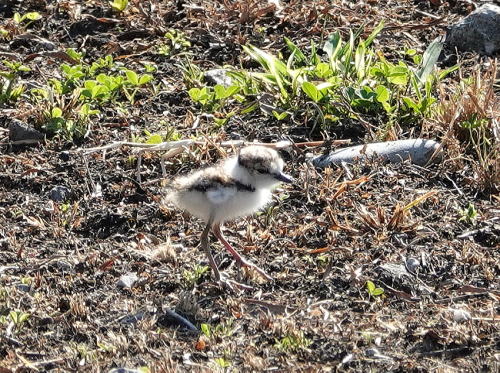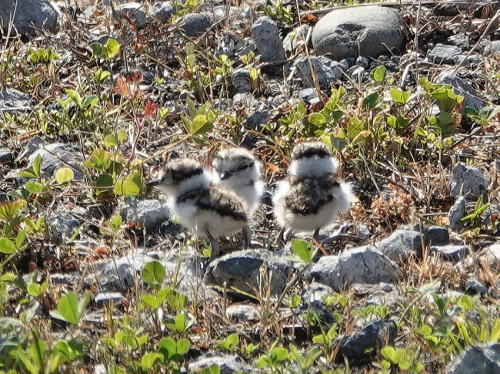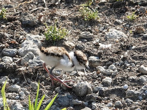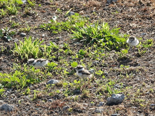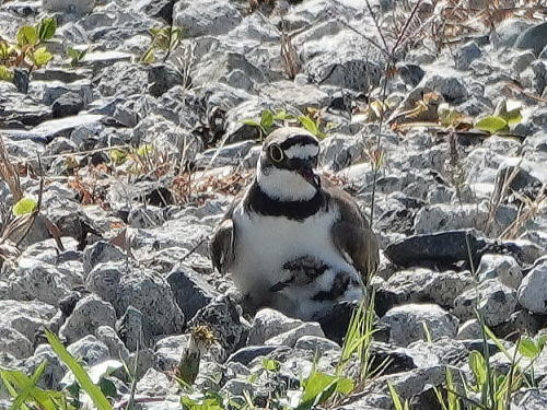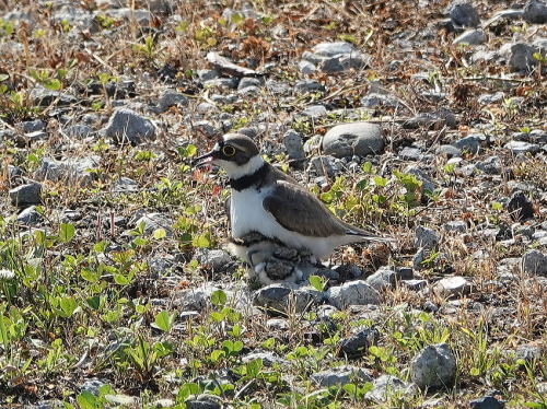 | コチドリ[5月27日] つい最近3羽孵ったようです。暑さ除けか警戒か、母さん?のお腹に潜りこみました。 | コチドリ[5月27日] 母さんが何処かへ行ってしまいました。 | |