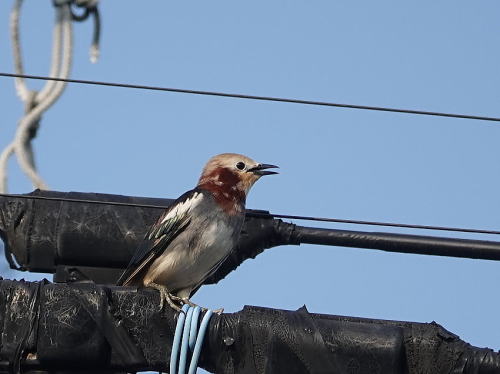 | オナガ[5月2日] 昨日とは別の場所、数羽が賑やかでした。 | コムクドリ[5月2日] 小糸川沿いを歩いていると1羽がふっと飛んできて鳴き続けていました。 | |