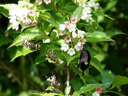 | アマサギ[5月22日] トンボを見つけて飛びつきましたが逃げられてしまいました。 | モンキアゲハ[5月22日] ハコネウツギが満開です。吸蜜に来ていました。 | |