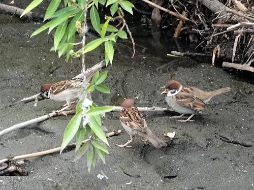 | スズメ[5月18日] 両端の2羽は幼鳥だと思います。親に餌をねだっています。 | チュウサギ[5月18日] 獲物が大きすぎて飲み込むのに時間がかかりました。 | |