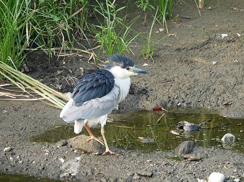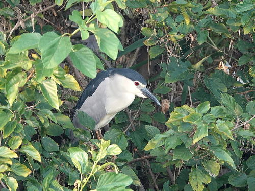| ゴイサギ[8月8日] ふと見ると河原の木に止まっていました。 | ゴイサギ[8月8日] 河原に下りブルブルッと体を振るわせてから飛び立って行きました。 | |