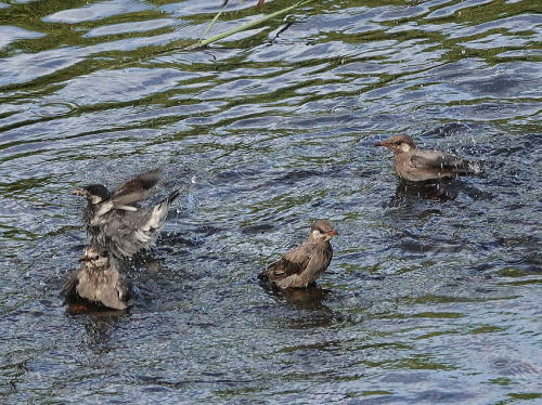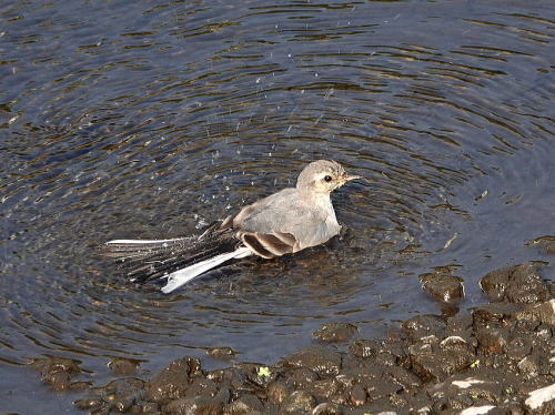 | ハクセキレイ[8月27日] 幼鳥が3羽いました。 | ムクドリ[8月27日] 次々にやって来てはブルブル、ブルブルと気持ちよさそうです。 | |