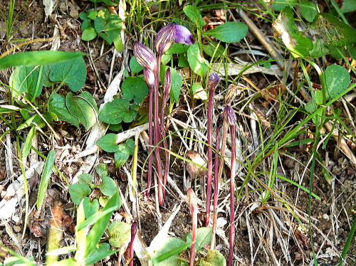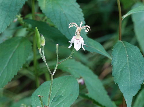 | ヤマホトトギス[8月13日] もう終わりでしょうか、一輪しか咲いていませんでした。 | ナンバンギセル[8月13日] 出始めたばかりです、ぽつぽつ咲いています。 | |