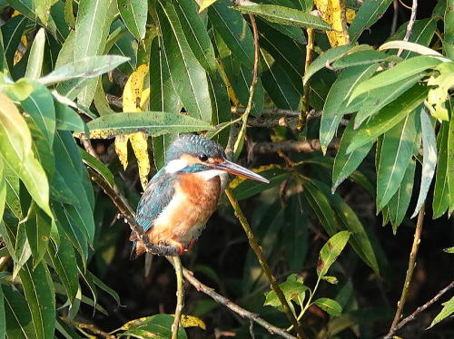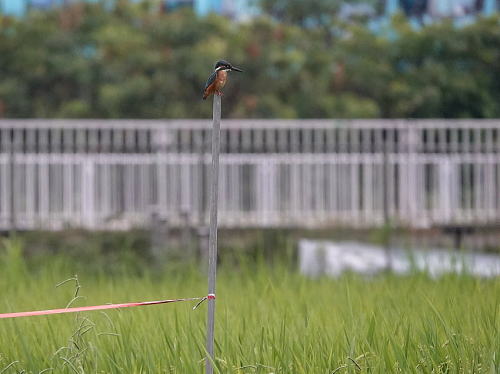 | ダイサギ[8月22日] ダイサギは1羽だけでした。 | カワセミ[8月22日] 下に田んぼの給水路があります。そこを泳ぐ魚を狙っているようでした。 | |