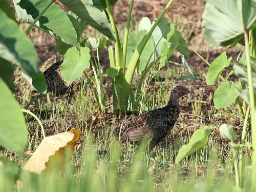 | キジ[8月7日] 若鳥です。手前が♂で左奥に見えているのが♀のようです。 | キジ[8月7日] 里芋の大きな葉に隠れて何羽いたのか分かりませんが、ここに4羽写っています。 | |