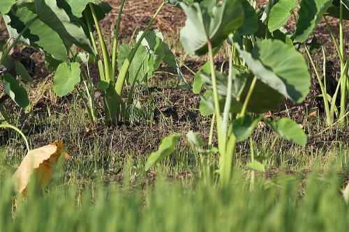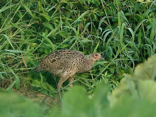 | キジ[8月19日] 里芋畑に若鳥♀が2羽いました。 | カルガモ[8月19日] 幼鳥2羽を連れたお母さんがいました。 | |