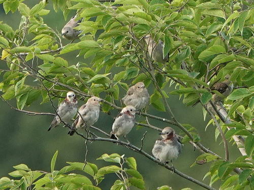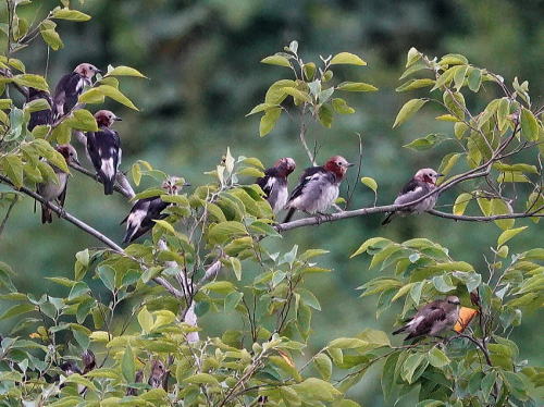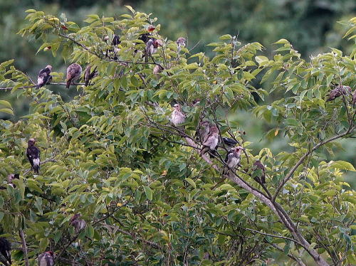 | コムクドリ[8月1日] 近くの木々から少しづつ集まって来ました。ここが塒のようです。 | コムクドリ[8月1日] 50羽以上を数えました。 | |