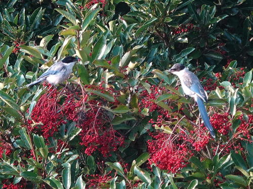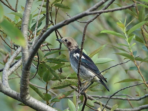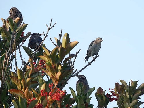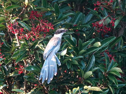 | オナガ[8月25日] サンゴジュの実を食べに群れでやって来ました。 | オナガ[8月25日] 若鳥のようです。 | |