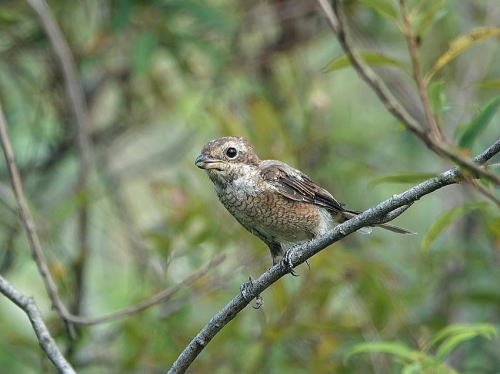 | コムクドリ[8月6日] 早い時間には餌場の方にいます。 | モズ[8月6日] 幼鳥です。でも近くに親を見かけません。 | |