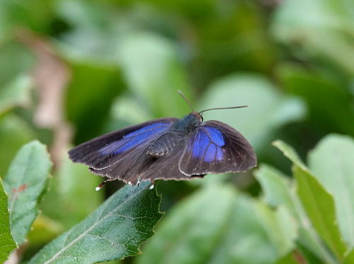 | ムラサキツバメ[8月31日] 歩道を歩いていると植え込みに飛んで来て止まりました。 | ||