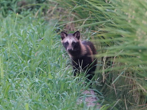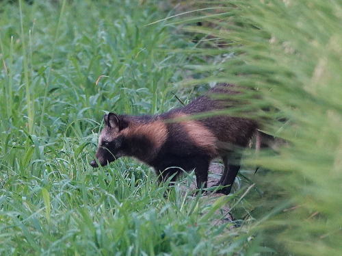 | タヌキ[8月17日] 夕方、田んぼの畦に居ました。餌を探しているようでした。 | タヌキ[8月17日] 近くの山から下りてきているのでしょうか。 | |