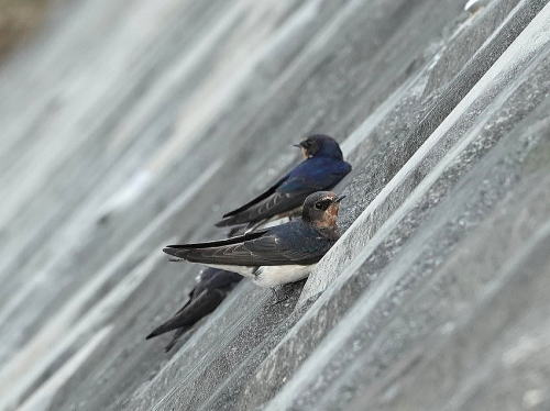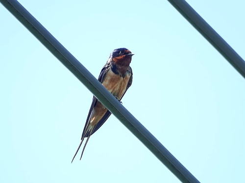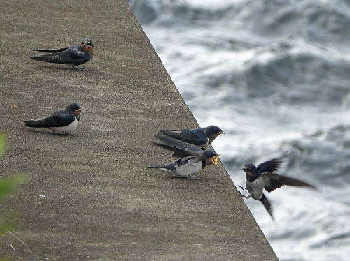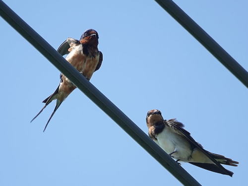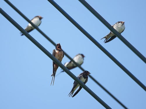 | アカハラツバメ、ツバメ[8月1日] 電線に沢山のツバメ(30羽くらい)が集まって来ました。 | アカハラツバメ[8月1日] 中にアカハラツバメの成鳥が1羽と、 | |