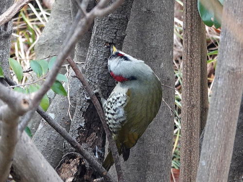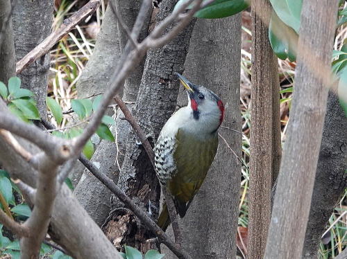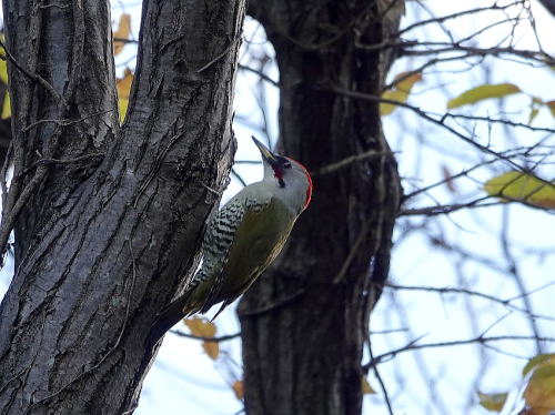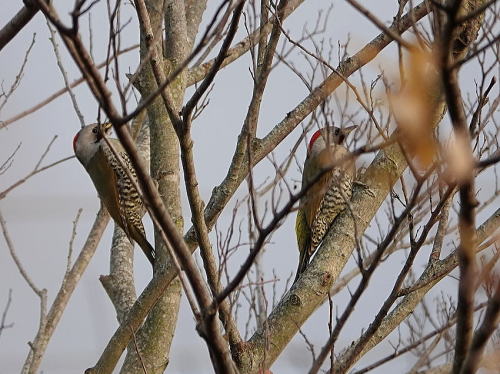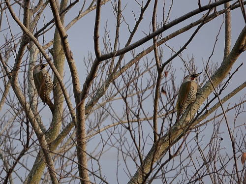 | アオゲラ[12月29日] 2羽が長い間静かに止まっていました。 | アオゲラ[12月29日] ヒヨドリやツグミが帰ってきて騒がしくなり飛んで行ってしまいました。 | |