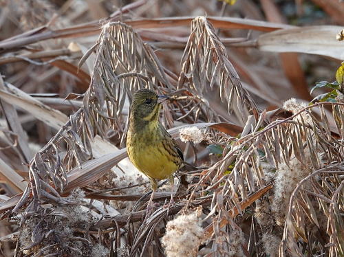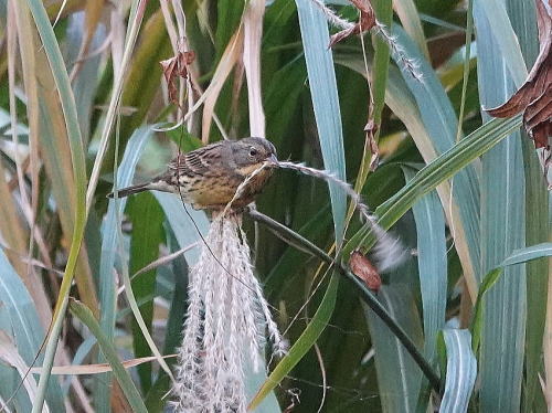 | ホオジロ[12月6日] ♀です。穂を切り取って食べています。 | ホオジロ[12月6日] ♂も直ぐ近くで採餌中でした。 | |