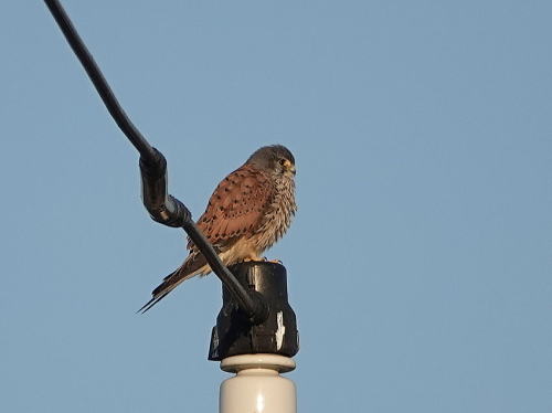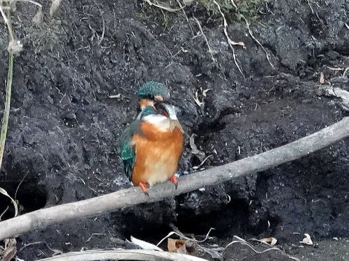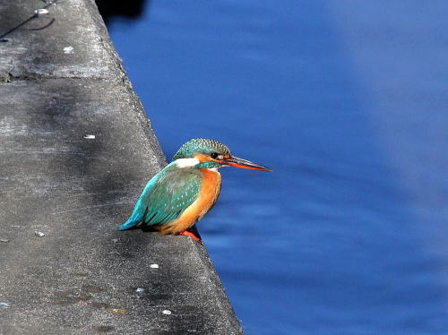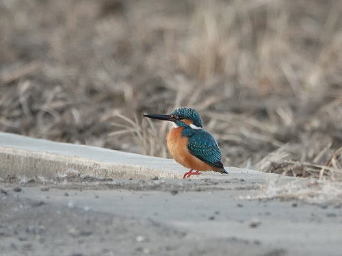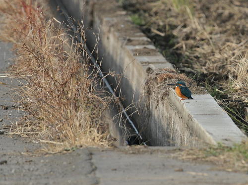 | チョウゲンボウ[12月26日] 下の草地にいる獲物を狙うにはいい場所です。 | カワセミ[12月26日] 農道沿いの用水路に止まりましたが、直ぐに自転車が通りかかり飛び去りました。 | |