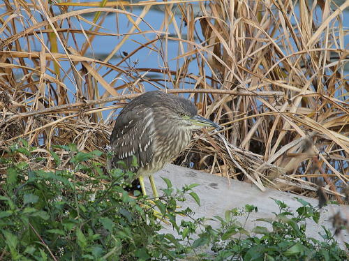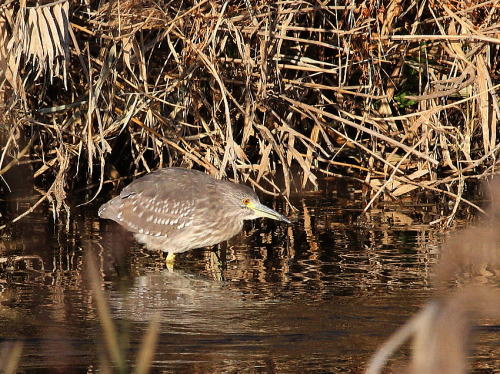 | キセキレイ[12月29日] 排水溝を歩き回って採餌していたようです。 | ゴイサギ[12月28日] 魚を狙っていました。 | |