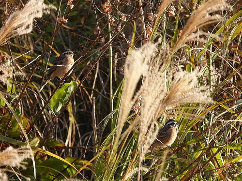 | ホオジロ[12月7日] 今日も穂を食べていました。 | ホオジロ[12月7日] 2羽が近くで採餌していました。 | |