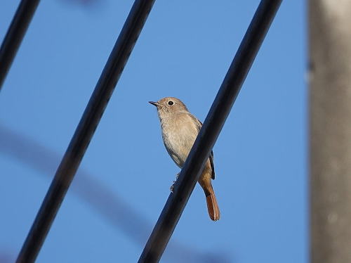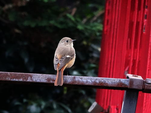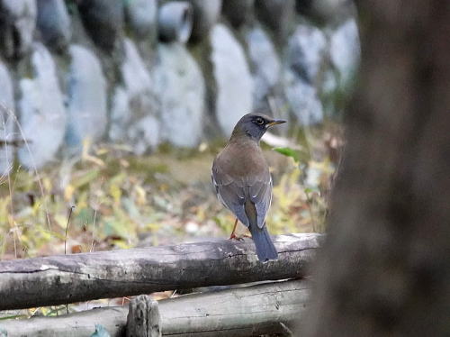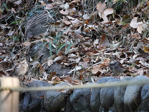| ツグミ[12月26日] 落ち葉を飛ばして餌を探しています。 | ジョウビタキ[12月26日] 小さなお稲荷さんの祠の柵です。 | |
