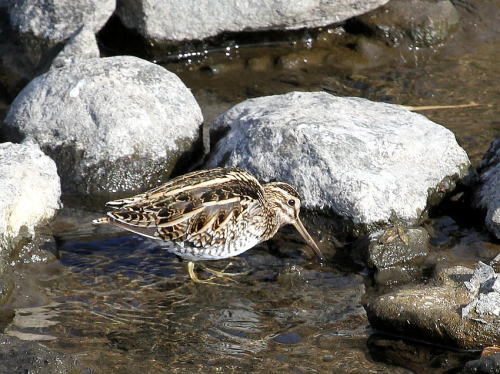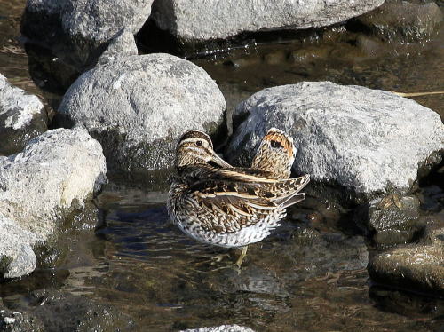 | タシギ[12月25日] 一か月ぶりの出合いです。念入りに羽繕いしていました。 | タシギ[12月25日] 羽繕いが終わると採餌をはじめました。 | |