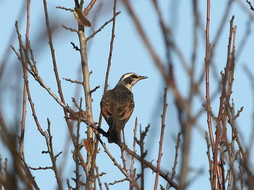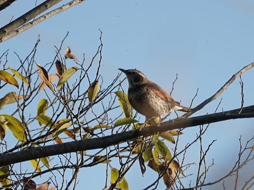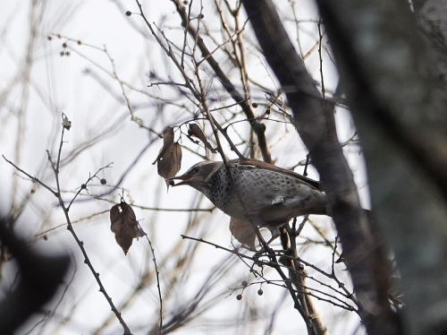 | ツグミ[12月20日] 居るのですが声ばかりでなかなか姿を見せてくれません。 | ジョウビタキ[12月20日] 今日は明るいうちに見られました。 | |