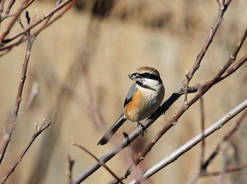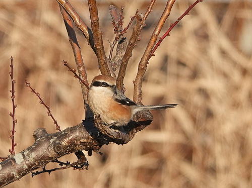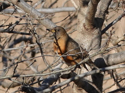 | アカハラ[1月10日] 帰りがけに堰堤に居るのに気づきました。 | モズ[1月10日] はやにえにしていた獲物を取りにきたようでした。 | |