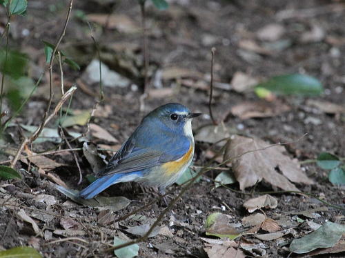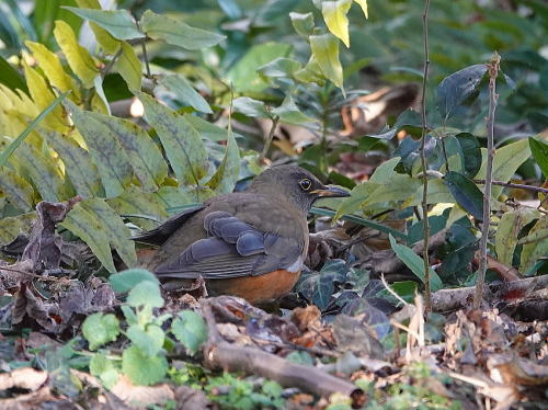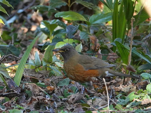 | アカハラ[1月30日] 植込みの下でガサガサと動く気配がありました。 | アカハラ[1月30日] 暗かったからか周りを気にせずせっせと落ち葉を飛ばして餌を探していました。 | |