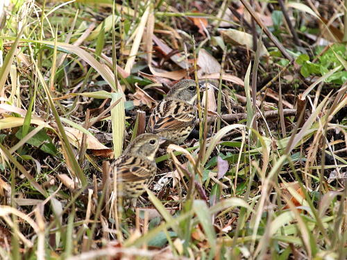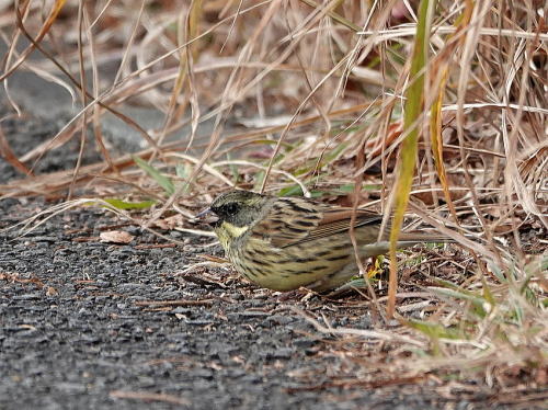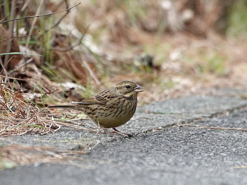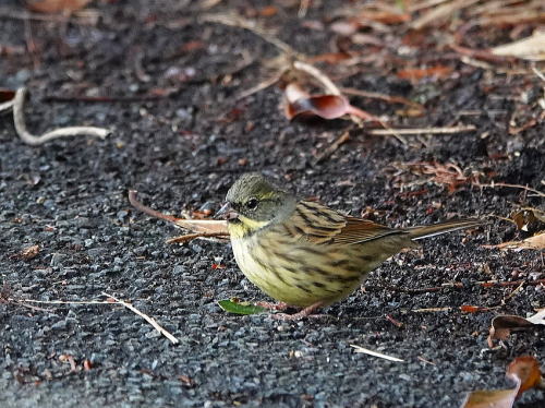 | アオジ[1月11日] 静かにしていると採餌しながら直ぐそばまでやって来ました。 | アオジ[1月11日] ♀も一緒に歩道に出て来て採餌中でした。 | |