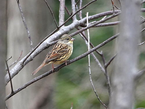 | アオジ[1月26日] 通行人に驚いて飛び上がりました。 | アオジ[1月26日] 暗い林の陰で採餌中でした。 | |