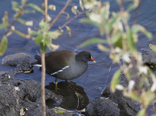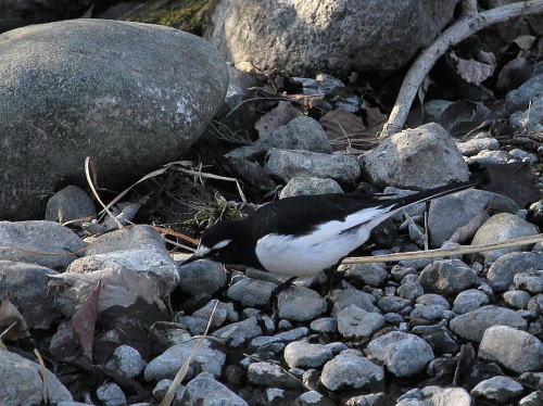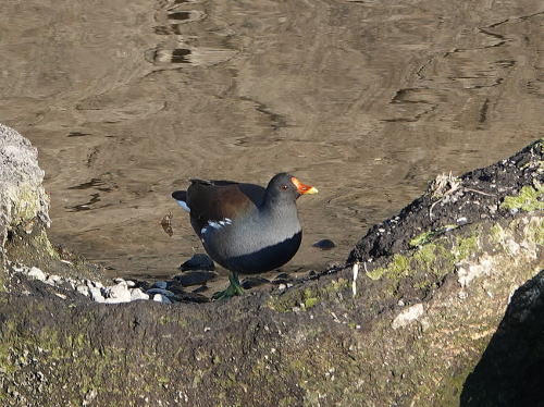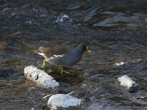 | セグロセキレイ[1月19日] 石の隙間を突きながら餌を探しているようです。 | バン[1月19日] 流れを遡って歩いて行きました。 | |