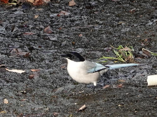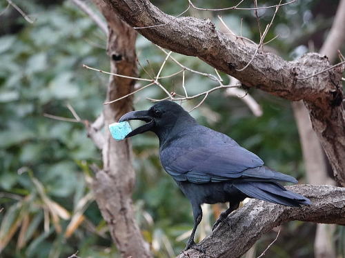 | ハシブトガラス[1月27日] このあと下りて青い物を遊歩道脇の落ち葉の中に隠しました。近くの木に止まり何度も嘴をぬぐい飛び去ったので、落ち葉を除けて探してみるとなんと石鹸でした。 | シロハラ[1月27日] この公園では初見です。 | |