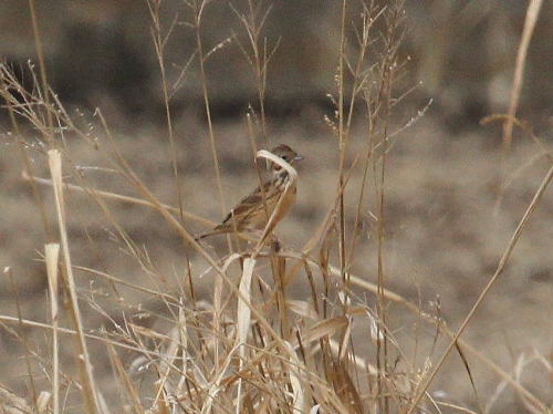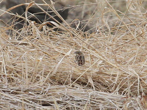 | ホオアカ[1月5日] 2羽来ているよと教えてもらっていたのですが、警戒心が強いので見つけられませんでした。やっと遠い所に居るのを見つけました。 | ホオアカ[1月5日] 超遠いのとか、枯れ草が邪魔で証拠写真です。いつか綺麗に撮りたいです。 | |
