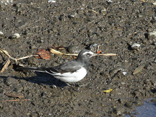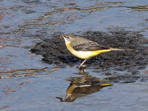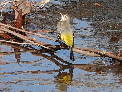 | キセキレイ[1月25日] 何かを獲りました。細長いもので何でしょうか。 | キセキレイ[1月25日] 満足したのか羽繕いを始めました。 | |