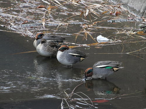 | エナガ[1月13日] 群れでやって来ました。 | コガモ[1月12日] 50羽くらい居ましたがほとんど寝てばかりでした。 | |