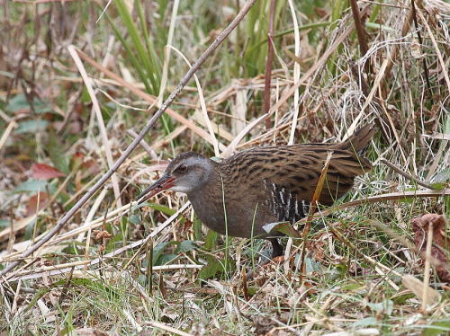 | クイナ[1月12日] 木道脇で採餌中でした。 | クイナ[1月12日] 人が通りかかったので茂みの中へ入りました。 | |