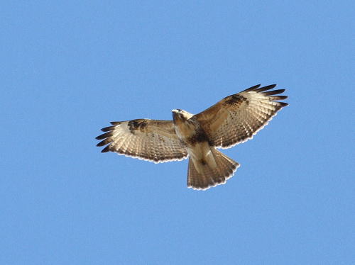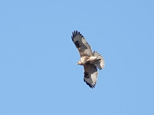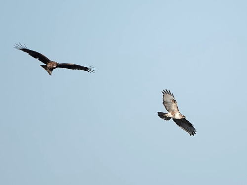 | トビ、ノスリ[1月30日] ノスリがトビに追いかけられていたようでした。でも気にせず悠々と舞っていました。 | ノスリ[1月30日] 少し離れてもう1羽のノスリが舞っていました。 | |