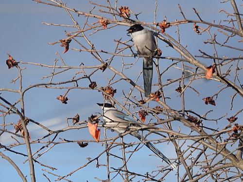 | オナガ[1月1日] 水浴びにも下りて来ます。 | オナガ[1月1日] 柿のヘタに残って干し柿のようになった実を食べていました。 | |