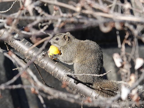 | アカハラ[1月10日] 居た!でも直ぐに飛ばれてしまいました。 | タイワンリス[1月10日] 食べているのはユズでしょうか? | |