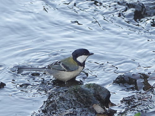 | モズ[1月14日] 草刈りが終わったばかりの場所で餌探しに忙しそうでした。 | シジュウカラ[1月14日] 水は冷たいと思うのですが、気持ち良さそうです。 | |
