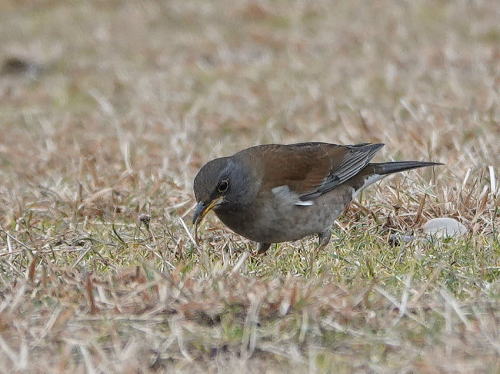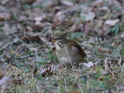 | シロハラ[1月27日] 芝生の広場で採餌中です。 | シロハラ[1月27日] 何を獲っているのかなと思いましたが、くわえているのはアリでしょうか。 | |