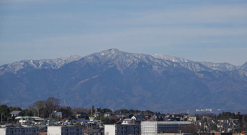 | 富士山[1月13日] あまり見慣れない冠雪の仕方です。頂上より五合目辺りが多いとは。 | 富士山、丹沢山塊[1月13日] 丹沢山も薄っすらと雪を冠っていました。 | |