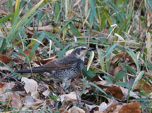 | アオジ[1月21日] 2羽で草の実を食べにやって来ました。 | ツグミ[1月21日] 遊歩道脇の芝生に通行人を気にせず長い間いました。 | |