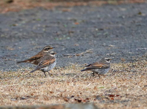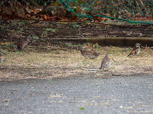 | ツグミ[1月24日] 今まであまり居なかった公園に沢山集まっていました。 | ツグミ[1月24日] 10羽くらい居ました。ここには7羽写っています。 | |
