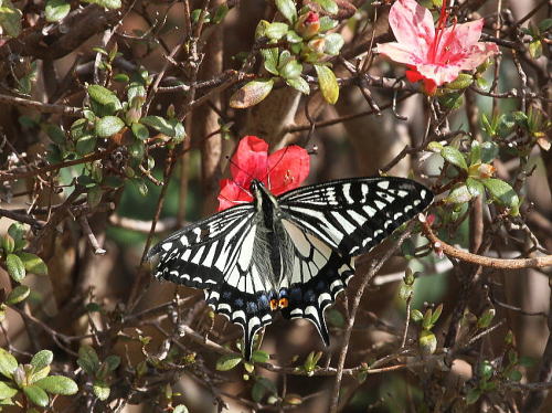 | アゲハ(ナミアゲハ)[3月16日] 蜜を吸いに来ました。 | アブラチャン[3月16日] 遠目には咲いているように見えませんが五分咲き位です。 | |