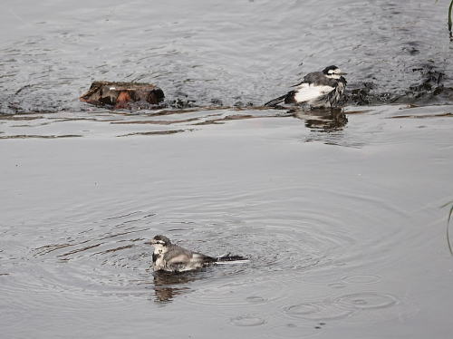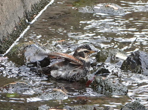 | ハクセキレイ[3月4日] 2羽が水浴びしていました。 | ツグミ[3月4日] こちらも勢いよく水浴び中です。 | |
