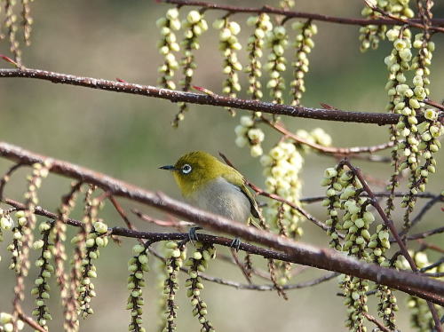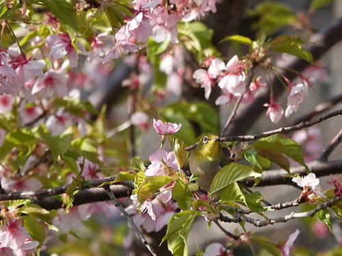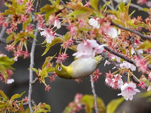 | メジロ[3月10日] キブシの蜜を吸いに来ました。 | メジロ[3月10日] カワヅザクラにもやって来ました。 | |