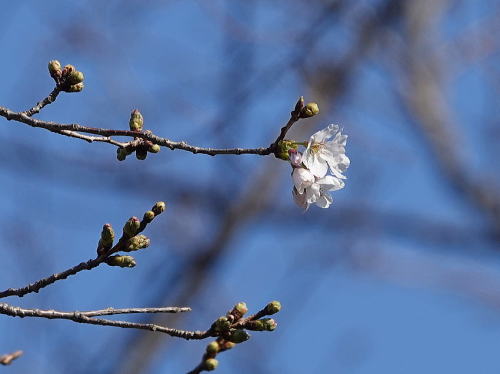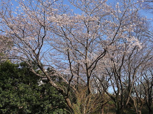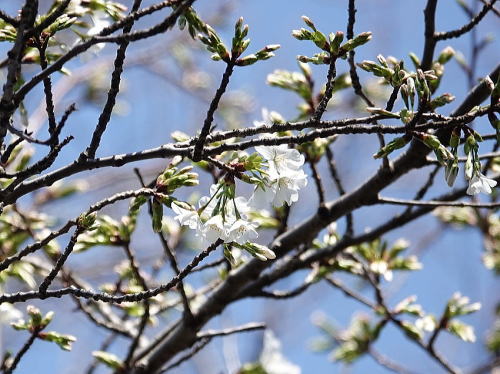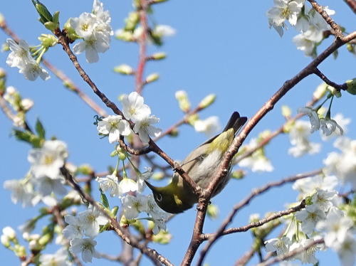| ソメイヨシノ[3月14日] この木だけ2、3輪とあと1、2輪咲いていました。 | オオシマザクラ、メジロ[3月14日] 満開近くになりました。 | |