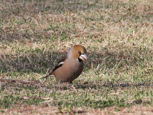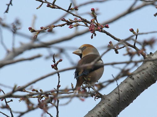 | シメ[3月17日] 今日は日向で見られました。 | シメ[3月16日] 暫くぶりです。手前の枝が邪魔でした。 | |