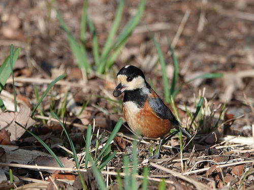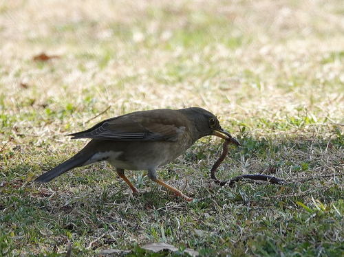 | エナガ[3月11日] 蛾でしょうか。何処かへ持っていくのかなと思いましたが食べてしまいました。 | シロハラ[3月11日] 大きなミミズを地面から引っ張り出しました。少し格闘しながら食べました。 | |